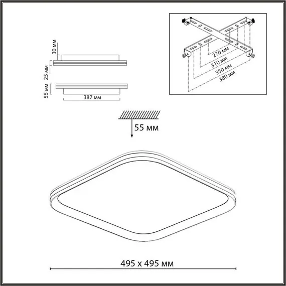 Артикул: 7750/95L; Бренд: Sonex; Коллекция: MITRA LED; Линия: BETA; Стиль: Minimalism; Назначение: Потолочный светильник; место размещения: в гостиную; в спальню; в детскую; Тип крепления: накладной; Степень защиты: IP20; Общая мощность, W: 95; Площадь освещения, м2: 28; Напряжение питания, V: 165-265; Класс защиты: 1; Класс электро-безопасности: I; Температурный режим: -20-(+40); Количество ламп: 1; Тип ламп: светодиодная (LED); Тип цоколя: LED; Мощность ламп, W: 95; Max мощность лампы, W: 95; Световой поток, Lm: 5700; Цветовая температура, K: 3000-4000-6000; Индекс цветопередачи: RA>80; Материал каркаса: металл, Металл; Материал плафона: PMMA; Поверхность каркаса: крашеный; Поверхность плафона: матовый; Цвет: белый; Цвет каркаса: белый, Белый; Цвет плафона: белый, Белый; Наличие пульта: Беспроводной пульт ДУ; Гарантия, мес: 30; Длина, мм: 495; Ширина, мм: 495; высота: 55; Вес, кг: 4.1; Вес упаковки, кг: 4.1; Длина упаковки, см: 550; Ширина упаковки, см: 550; Высота упаковки, см: 120; Объем упаковки, м3: 0,03630; Штрихкод: 4690344150552